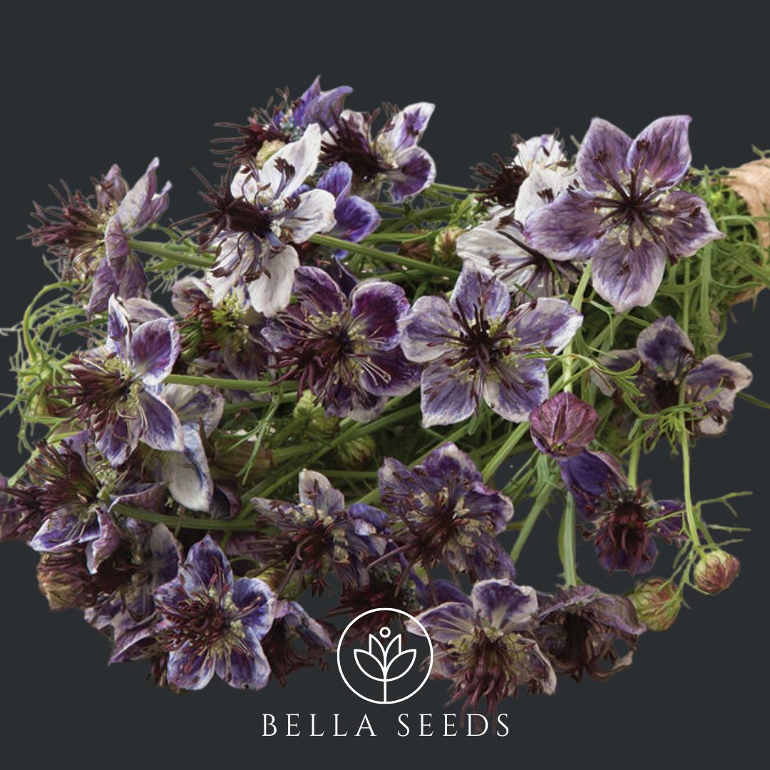 Delft Blue Nigella, inspired by the renowned Dutch Delft blue pottery, features distinct 1½–2 inch flowers. The petals exhibit a stunning mix of blue and gray shades, with intricate deep-purple centers adding to their charm. This plant also produces unique seed pods that are perfect for both fresh and dried arrangements.
