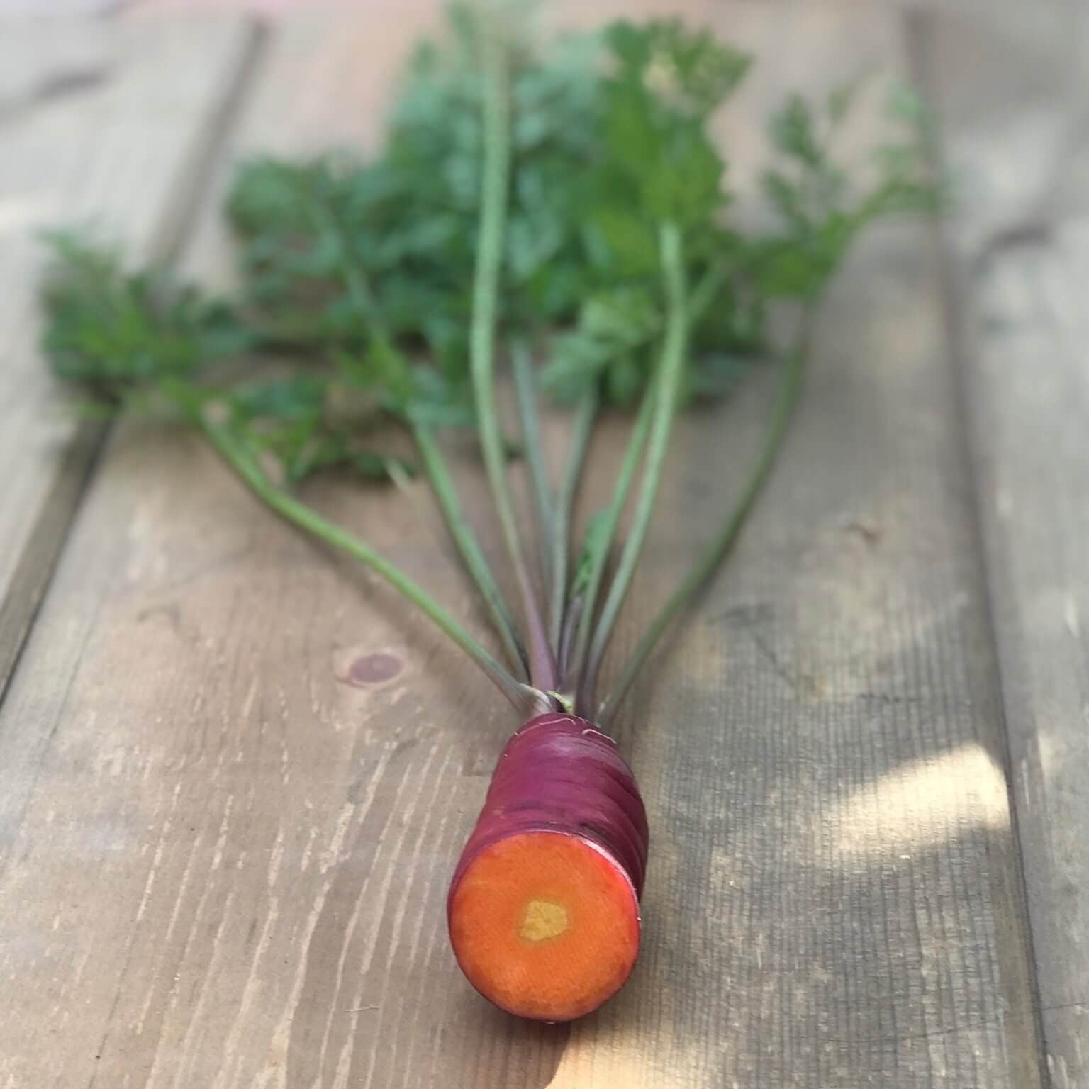 This out-of-this-world carrot has it all: gorgeous color, distinct flavor and loads of nutrition. A nantes-type, Cosmic Purple Carrot has cylindrical, 7-in. roots with smooth purple skins and an orange, coreless interior. The crunchy, very sweet roots have just a hint of spiciness and are a colorful addition to relish trays and salads. They're excellent cooked and roasted too! These carrots retain their purple color even with cooked.