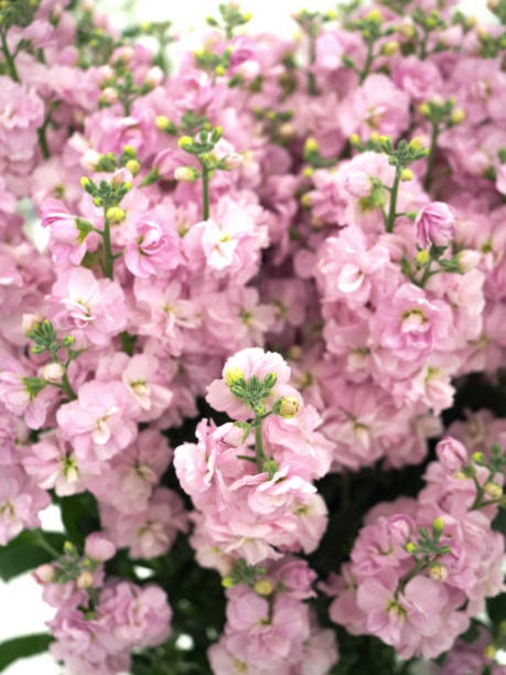 Single-stemmed florist types have dense, showy spikes of scented, large, double flowers closely spaced on the stems. Sweetly scented. Excellent cut flowers. Considered a hardy annual. Stock is a favorite crop among growers due to its fast maturity time. The ability to withstand cooler temperatures — down to 10–20°F (-12– -7°C) — allows for season extension.