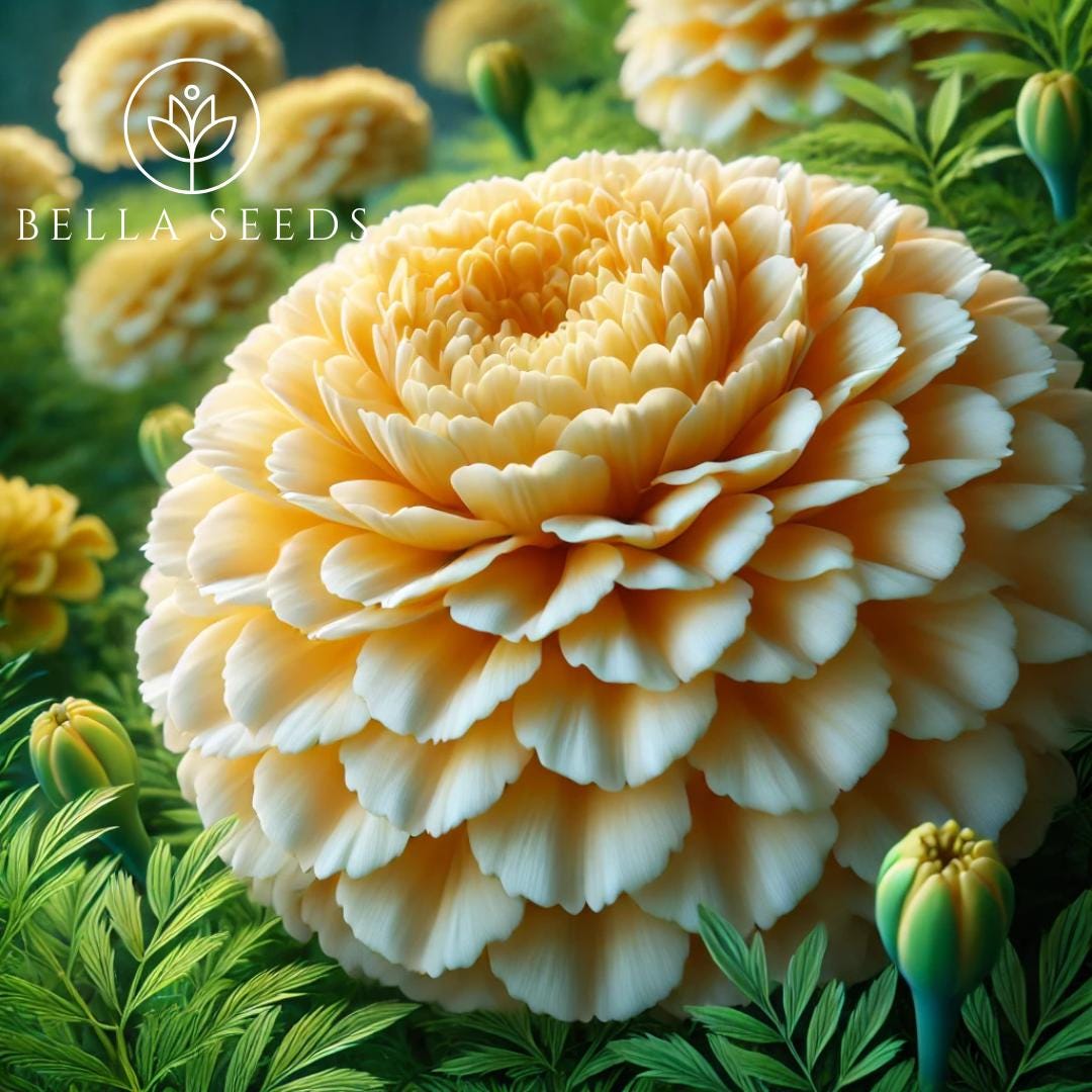 The White Swan marigold is a unique variety distinguished by its 2-3" cream to pale yellow, fully double blooms on sturdy, compact plants. Unlike typical marigolds, it emits a mild, sweet, marshmallow fragrance, and it surpasses other cream-colored marigolds in height and quality. Also known as African, American, or Aztec marigold, its flowers are edible, offering a floral, citrusy, and slightly bitter flavor, suitable for salads, desserts, and cooked dishes, with the recommendation to remove the bitter flower base before consumption.